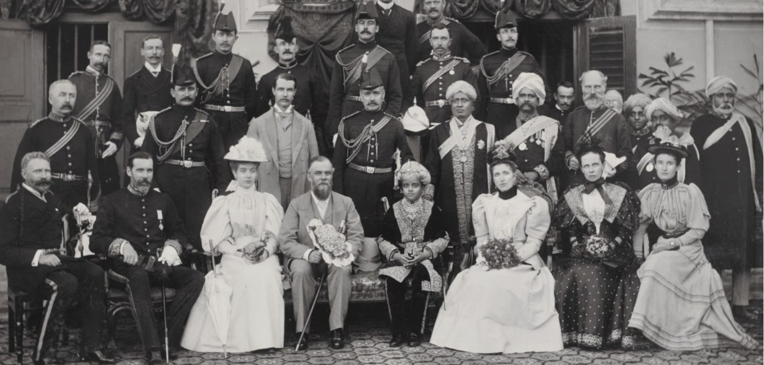 Formal group portrait taken on the occasion of Krishnaraja Wadiyar’s accession. Mysore, 1895.The Earl of Elgin, H.H. Krishna Raja Wodeyar, and officers of the State Mysore. Source : http://www.bl.ukT. R. A. Thumboo chetty could be seen standing next to the Dewan K. Seshadri Iyer.