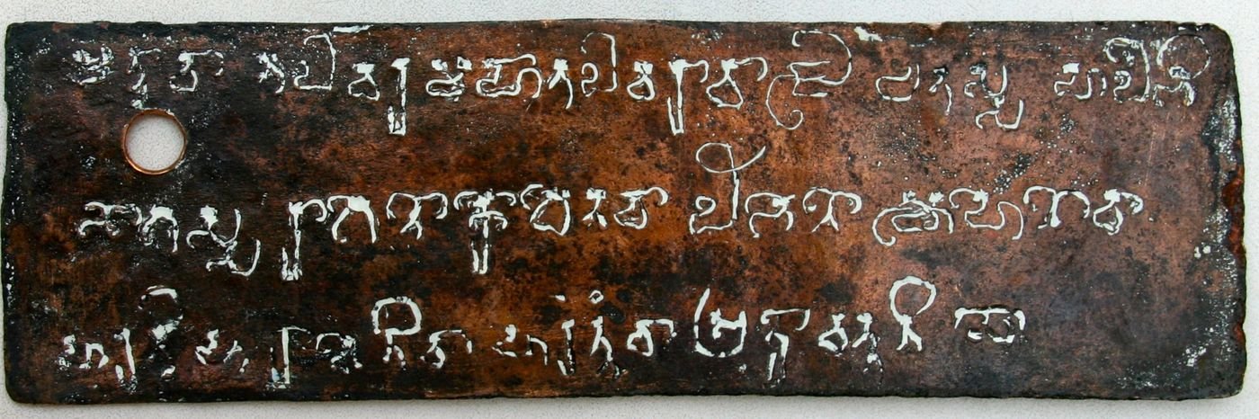 Support: Five copper plates, not furnished with original plate numbering; h. 7 × w. 22-23 cm. The left side of every plate is pierced by a hole through which runs a ring, to which is soldered “a roughly oval seal, which is worn out completely” (Ramachandra Murthy 1999: 114).