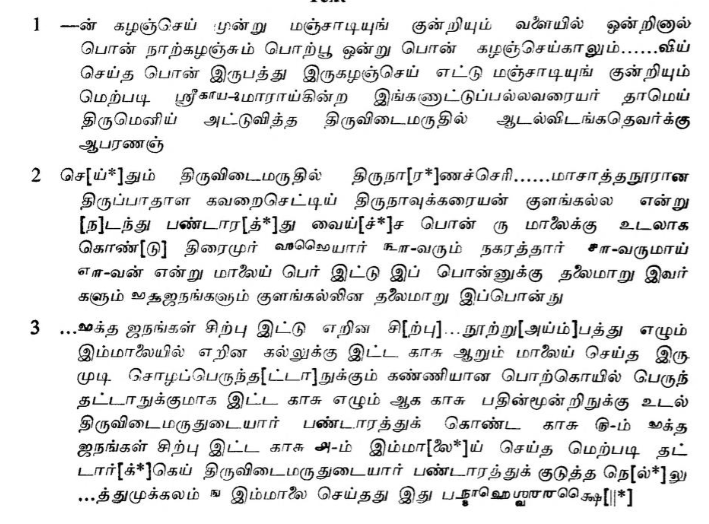 1 -ன் கழஞ்செய் மூன்று மஞ்சாடியுங் குன்றியும் வளையில் ஒன்றினால் பொன் நாற்கழஞ்சும் பொற்பூ ஒன்று பொன் கழஞ்செய்காலும்……விய் செய்த பொன் இருபத்து இருகழஞ்செய் எட்டு மஞ்சாடியுங் குன்றியும் மெற்படி ஸ்ரீகாயஃமாராய்கின்ற இங்கணாட்டுப்பல்லவரையர் தாமெய் திருமெனிய் அட்டுவித்த திருவிடைமருதில் ஆடல்விடங்கதெவர்க்கு ஆபரணஞ்