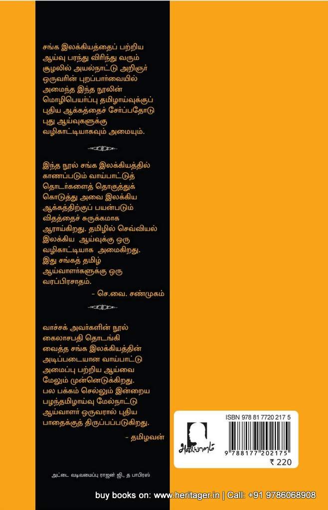 சங்க இலக்கியத்தைப் பற்றிய ஆய்வு பரந்து விரிந்து வரும் சூழலில் அயல்நாட்டு அறிஞர் ஒருவரின் புறப்பார்வையில் அமைந்த இந்த நூலின் மொழிபெயர்ப்பு தமிழாய்வுக்குப் புதிய ஆக்கத்தைச் சேர்ப்பதோடு புது ஆய்வுகளுக்கு வழிகாட்டியாகவும் அமையும்.